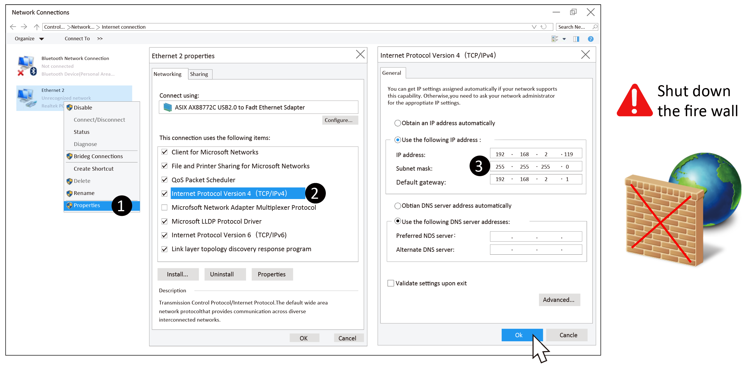 * PC IP address: 192 . 168 . 2 . 3 (only the last number should be different than 119.)&#x20;