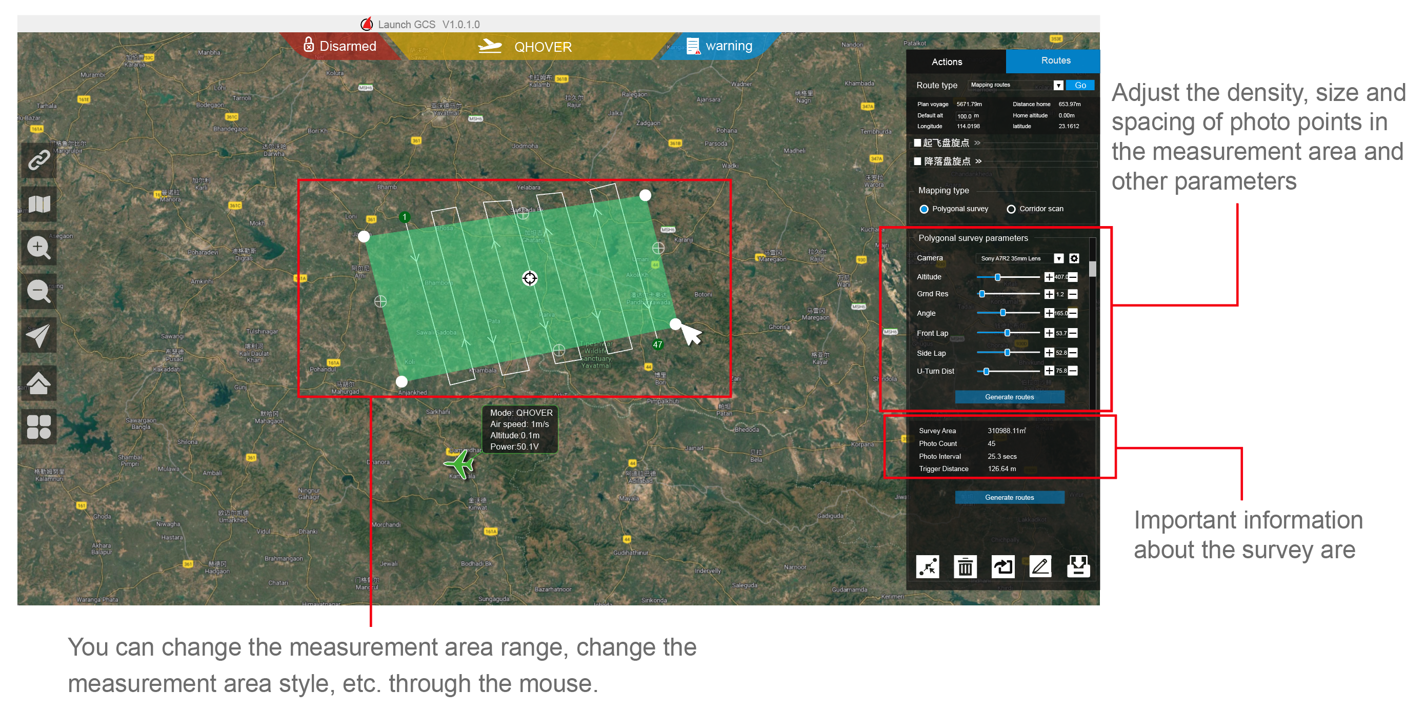 &#x20;3.2.5. After adjusting the required parameters, surveying area, and then click the “Generata Routes” button to automatically generate surveying and mapping waypoints and photo points in the surveying and mapping area.