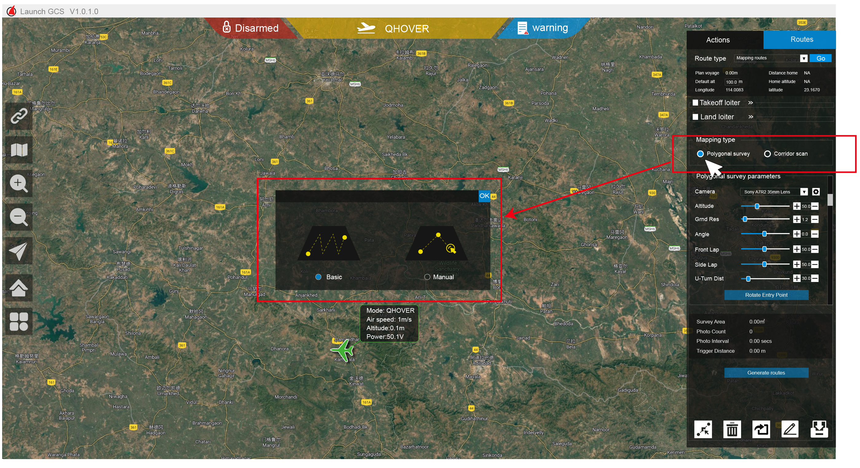3.2.2. After entering the surveying and mapping route drawing, <mark style="color:orange;">select the required camera and set the surveying and mapping parameters of the corresponding camera.</mark>