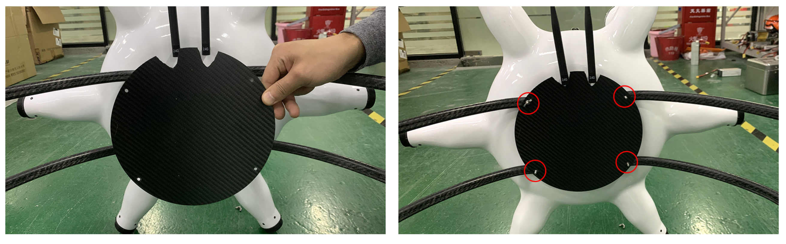 2.5. Fix the batteries (2\*25000mAh batteries) in the fuselage,and power on according to the cable label,Close the cover and fasten the button.